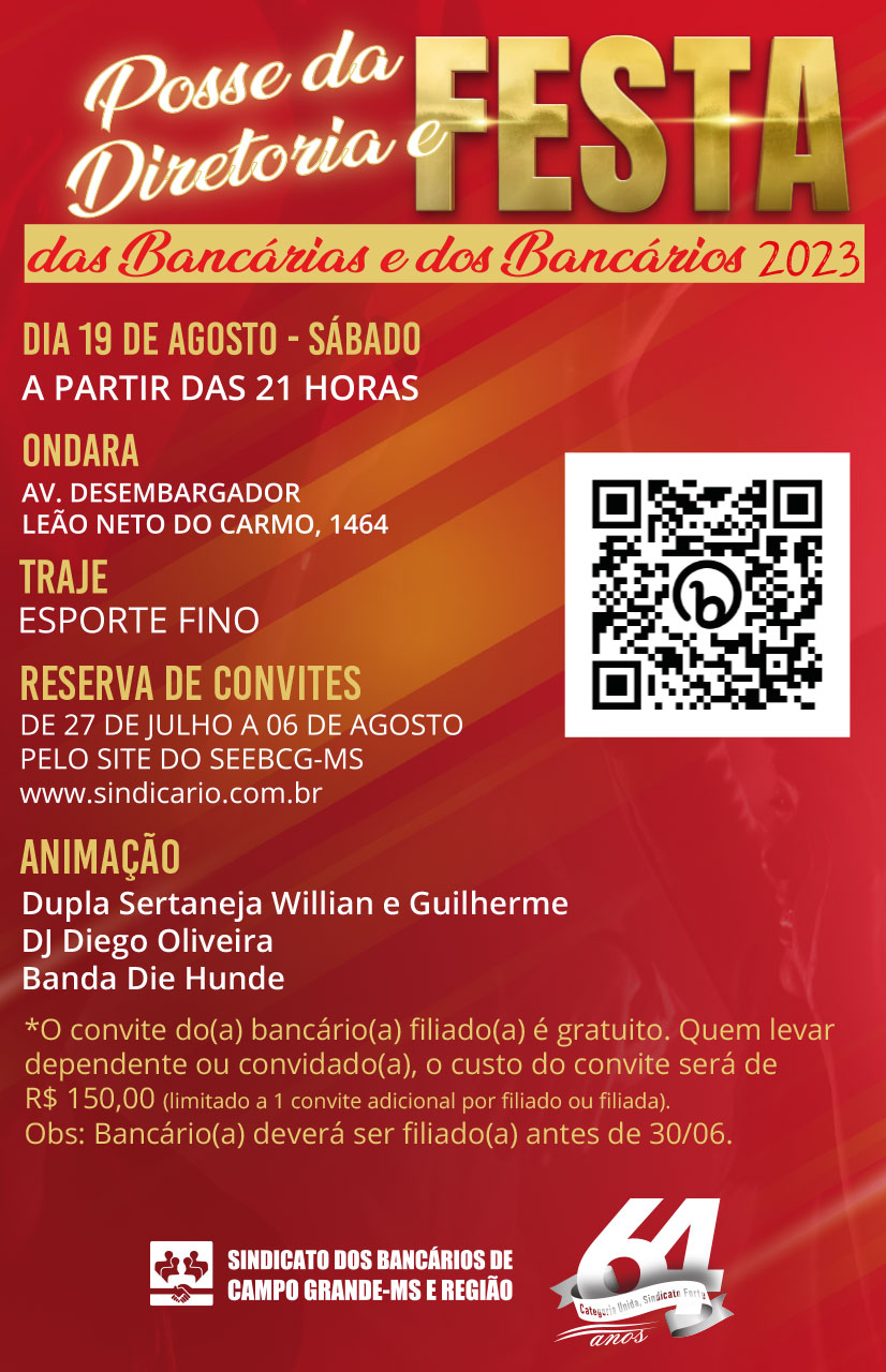 A Festa d@s Bancári@s de 2023 do SEEBCG-MS será no dia 19 de agosto, sábado, a partir das 21h, no Ondara Palace, em Campo Grande.