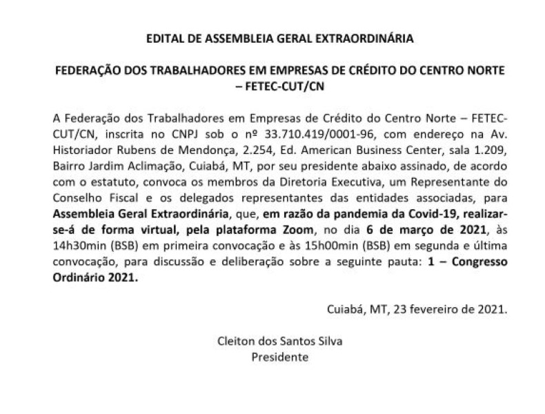 A Federação dos Bancários do Centro-Norte (Fetec-CUT/CN) realizará Assembleia Geral Extraordinária no dia 6 de março, às 14h30, para discutir o Congresso Ordeinário de 2021 da entidade.