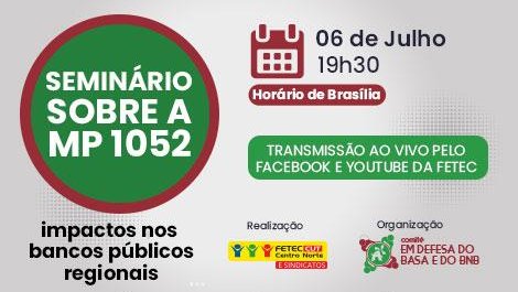 A Federação dos Bancários do Centro-Norte (Fetec-CUT/CN) realizará nesta terça-feira 6 de julho, às 19h30 (horário de Brasília), o seminário Os impactos MP 1052 nos bancos públicos regionais, com participação da assessoria jurídica da entidade e do senador Paulo Rocha (PT-PA).