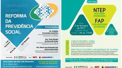 A Federação dos Bancários do Centro Norte (Fetec-CUT/CN) realiza nos dias 2 e 3 de fevereiro, respectivamente, uma oficina sobre Nexo Técnico Epidemiológico (NTEP) e sobre Fator Acidentário de Prevenção (FAP) e o Seminário sobre Reforma da Previdência Social. Tendo como palestrantes especialistas consagrados nos dois temas, ambos os eventos serão realizados na capital federal, com o apoio do Sindicato dos Bancários de Brasília e da CUT Brasília.