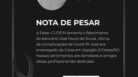 A Federação dos Bancários do Centro-Norte (Fetec-CUT/CN) manifesta profundo pelo falecimento do bancário José Paulo de Souza, 59 anos, na madrugada desta terça-feira, 20/4, no Hospital Samar, em Porto Velho, por complicações da covid-19. Ele era funcionário da agência da Caixa Econômica Federal no município de Espigão do Oeste.