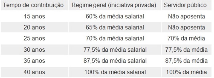 A nova proposta vai diminuir o valor a ser pago aos trabalhadores em praticamente todas as faixas, conforme tabela abaixo. Mesmo quem conseguir atingir a idade mínima imposta na nova proposta, mas contribuir, por exemplo, apenas 15 anos, que é o tempo mínimo exigido, vai receber apenas um benefício parcial, de apenas 60% da média de todas as suas contribuições.