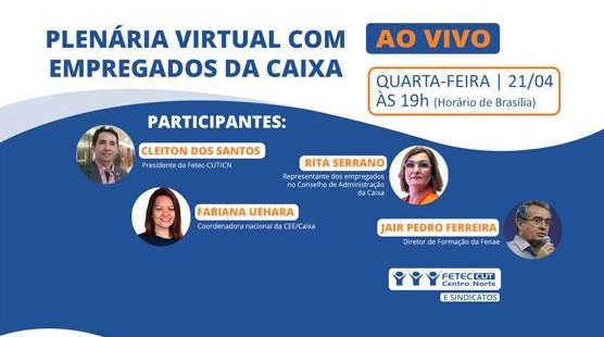 A Federação dos Bancários do Centro-Norte (Fetec-CUT) realizará na quarta-feira 21 de abril, às 19h, plenária virtual dos empregados da Caixa para discutir as questões pendentes com o banco, entre elas o pagamento justo da PLR Social, IPO da Caixa, a inclusão dos bancários como grupo prioritário na vacinação contra a Covid-19 e em defesa da Caixa 100% pública. A plenária será transmitida ao vivo nas páginas da Fetec-CUT/CN no Facebook (https://www.facebook.com/feteccutcn/posts/302590924826985) e no YouTube (https://youtu.be/7KBUR7z2CGY).