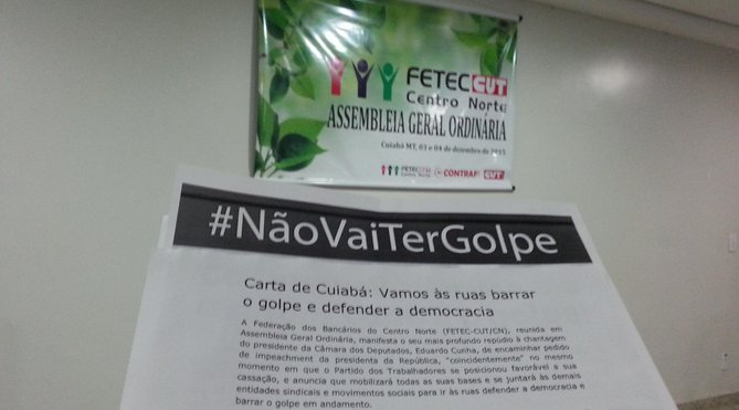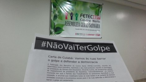 Reunida em Assembleia Geral Ordinária, a Federação dos Bancários do Centro Norte (Fetec-CUT/CN) lançou nesta quinta-feira 3 a Carta de Cuiabá: Vamos às ruas barrar o golpe e defender a democracia, na qual “manifesta o seu mais profundo repúdio à chantagem” de Eduardo Cunha, ao abrir processo de impeachment contra a presidenta da Dilma Rousseff, e avisa que mobilizará todas as suas bases e se juntará às demais entidades sindicais e movimentos sociais para ir às ruas defender a democracia e barrar o golpe em andamento”.