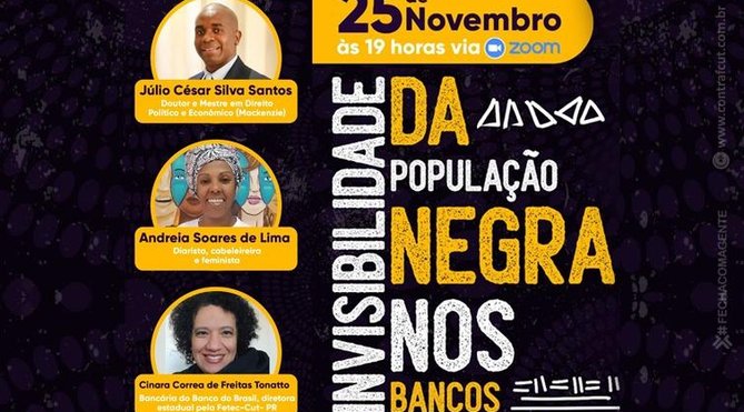 A Federação dos Trabalhadores em Empresas de Crédito do Paraná (Fetec-PR) promove, nesta sexta-feira (25), a plenária “Invisibilidade da População Negra nos Bancos”, das 19h até às 21h. O evento, que faz parte das atividades do mês da Consciência Negra, será online, com transmissão pela plataforma Zoom.