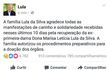 Em sua página no Facebook, o ex-presidente Luiz Inácio Lula da Silva agradeceu as manifestações de carinho e solidariedade durante a internação de Marisa Letícia durante os últimos dias. Marisa Letícia foi internada no dia 24 de janeiro, quando sofreu um acidente vascular cerebral.