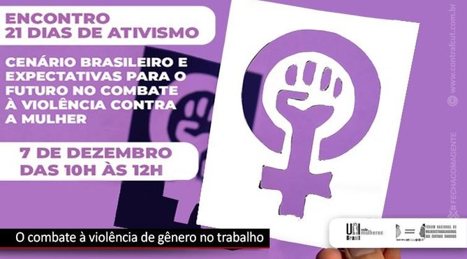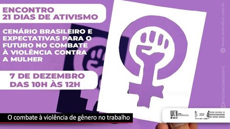 A Rede de Mulheres UNI Brasil e o Fórum Nacional de Mulheres Trabalhadoras das Centrais Sindicais realizam na quarta-feira, 7 de dezembro, das 10h às 12h, o “Encontro 21 Dias de Ativismo – Cenário Brasileiro e Expectativas para o Futuro no Combate à Violência contra a Mulher”. O evento é realizado no contexto dos 21 Dias de Ativismo, que começaram em 20 de novembro (Dia da Consciência Negra), passando pelo dia 25 (Dia de Combate à Violência Contra a Mulher), e se encerram em 10 de dezembro (Dia Internacional dos Direitos Humanos).