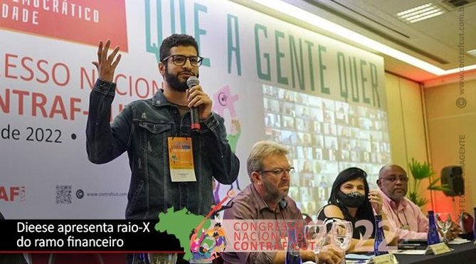 No final da manhã do segundo dia do 6º Congresso da Confederação Nacional dos Trabalhadores do Ramo Financeiro (Contraf-CUT), ocorreu o segundo painel, em que foi feito o Retrato dos Bancos e dos Bancários, pelo economista Gustavo Cavarsan, da subseção da Contraf-CUT do Departamento Intersindical de Estatística e Estudos Socioeconômicos (Dieese). A apresentação fez o mapeamento dos trabalhadores e trabalhadoras do ramo financeiro, com subsídios para a estratégia de atuação da entidade nos próximos anos.