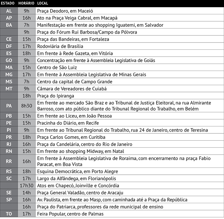 Em São Paulo, além de mobilizações em aeroportos e estradas, CUT, CTB, Intersindical e os movimentos sociais farão um ato na Avenida Paulista, a partir das 16h, em frente ao Masp. A seguir, os manifestantes sairão em passeata até a Praça da República, no centro da cidade, onde encontrarão os professores da rede estadual, que estarão em assembleia.
