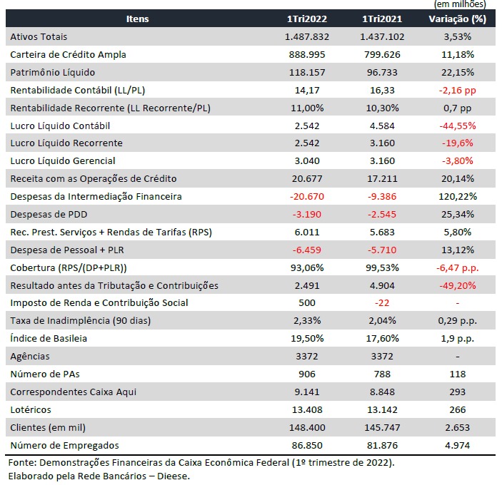 O lucro líquido contábil da Caixa Econômica Federal foi de R$ 2,542 bi no primeiro trimestre de 2022, o que representa uma queda de 44,6% em relação ao mesmo período de 2021, quando havia sido de R$ 4,584 bi. Essa queda se deve ao fato de que, em 2021, o resultado foi inflado por evento não recorrente vinculado à venda de participação na Caixa Seguridade. O resultado, em 2022, não sofreu influências de eventos não recorrentes.