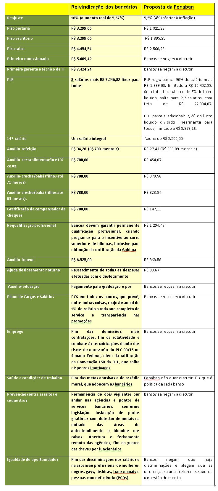 Compare as diferenças entre o que os bancários reivindicam e o que os bancos propõem: