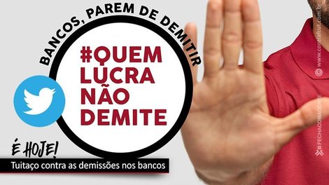 Hoje, quinta-feira (15), é o Dia Nacional de Luta Contra as Demissões nos Bancos. A ação faz parte da campanha que será feita por sindicatos de bancárixs de todo o Brasil. O tuitaço de hoje será às 16h e quem participar deve usar as imagens e as frases nas suas contas do Twitter com a hashtag #QuemLucraNãoDemite.