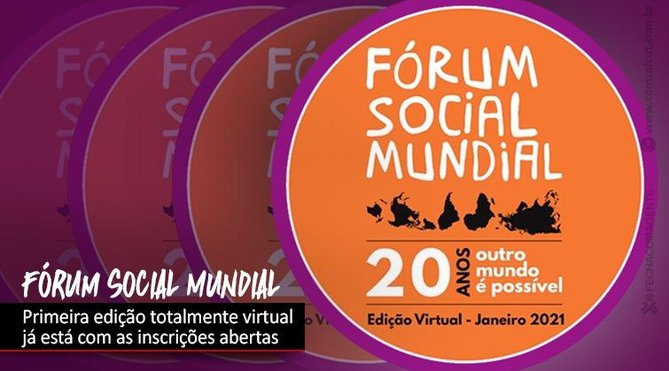 As inscrições para o Fórum Social Mundial Virtual, que será realizado de 23 a 31 de janeiro de 2021, já estão abertas. Para superar os obstáculos impostos pela pandemia do novo coronavírus (Covid-19), o evento, que marca os 20 anos da primeira edição, em Porto Alegre, em 2001, será realizado totalmente online.