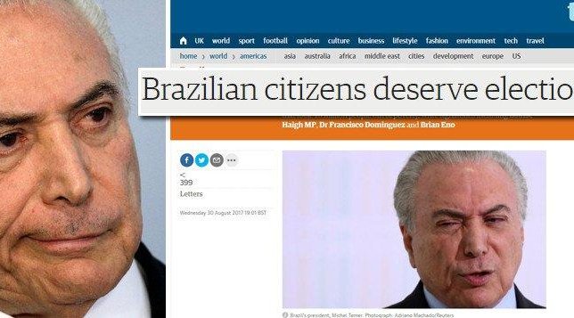 Um carta redigida por acadêmicos, intelectuais e políticos britânicos, publicada no jornal The Guardian, clama por novas eleições no Brasil. O texto diz que os brasileiros merecem novas eleições "agora".