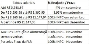 A Fenaban também segue recusando aumento real nas demais verbas, que receberiam reajuste apenas pelo INPC, somente a partir de 1º de novembro, incluindo PLR, vales alimentação e refeição. Veja tabela da última proposta: