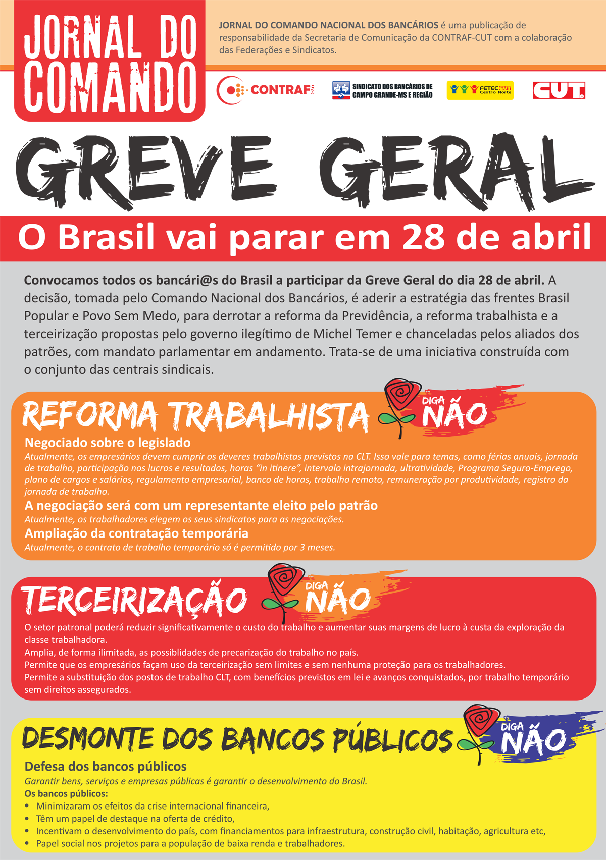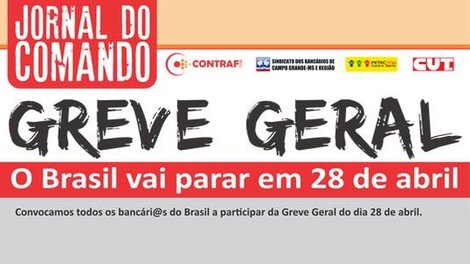 Campo Grande MS - A publicação traz pontos básicos das reformas trabalhista e da Previdência, sobre a Lei da Terceirização e o desmonte dos bancos públicos. Além disso, convoca os bancários para a greve geral do dia 28 de abril.