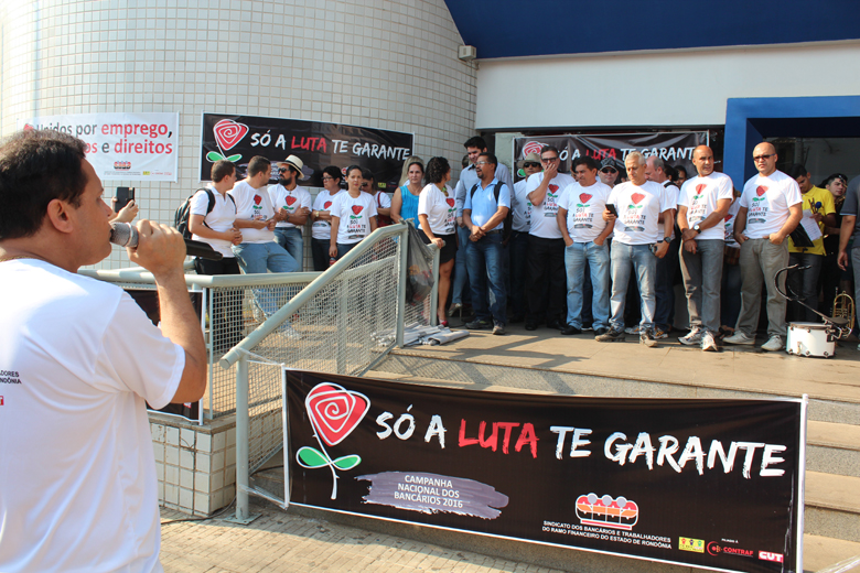 Porto Velho RO - Com o tema "Só a Luta te Garante", a Campanha Nacional dos Bancários 2016 foi lançada oficialmente em Rondônia na manhã desta sexta-feira, 12/8, em frente ao prédio da agência Madeira-Mamoré da Caixa Econômica Federal, no Centro de Porto Velho.