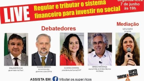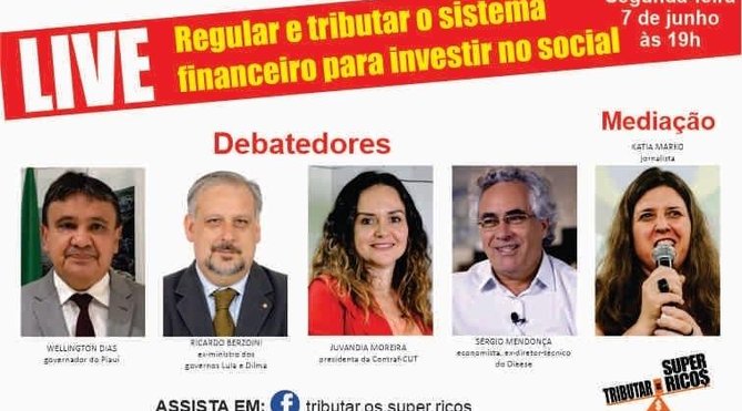 O governador do Piauí, Wellington Dias, o ex-ministro, Ricardo Berzoini, o economista e ex-diretor-técnico do Departamento Intersindical de Estatística e Estudos Socioeconômicos (Dieese), Sergio Mendonça, e a presidenta da Confederação Nacional dos Trabalhadores do Ramo Financeiro (Contraf-CUT), Juvandia Moreira, vão debater, nesta segunda-feira (7), a partir das 19h, sobre o sistema financeiro brasileiro, os tributos que incidem sobre o setor, um dos que mais lucram no Brasil, e de que forma tais tributos podem contribuir para o aumento dos investimentos sociais no país.