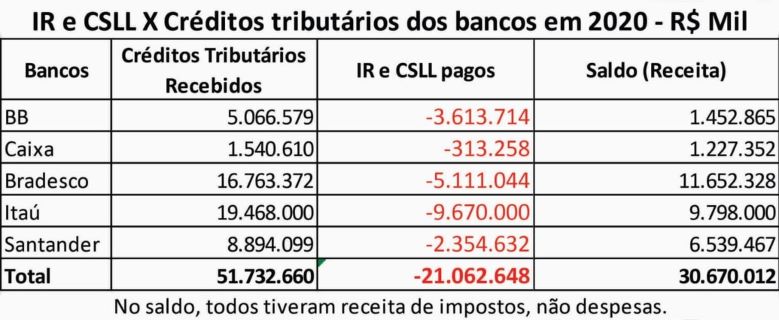 Mario explicou que os bancos não emprestam dinheiro nos momentos de crise para evitar prejuízos com calotes de pessoas e empresas, mas quando têm “prejuízos” conseguem recuperar o dinheiro com “créditos tributários”, que em 2020 superou em valor o que eles deveriam pagar.