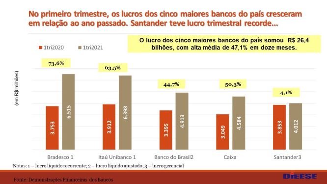 No primeiro trimestre de 2021, o lucro dos cinco maiores bancos do país somou R$ 26,4 bilhões, com alta média de 47,1% em doze meses.