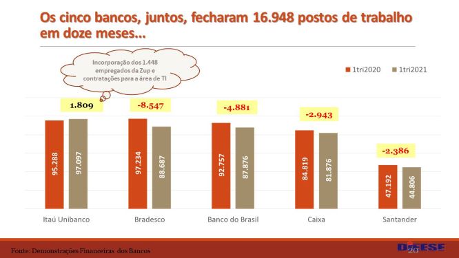 Os bancos fazem de tudo para aumentar ainda mais seus lucros. Em plena pandemia, encolheram seus quadros de funcionários e promoveram mais desemprego. Um levantamento do Dieese mostra que, em 2020, houve uma redução de 13.071 postos de trabalho bancário. Considerando o período de um da pandemia no Brasil (março de 2020 a março de 2021), os cinco maiores bancos do país (Caixa, Banco do Brasil, Bradesco, Itaú e Santander), juntos, fecharam 16.948 postos de trabalho.