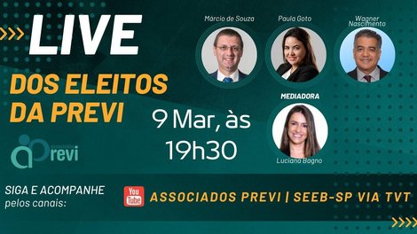 A live terá transmissão ao vivo pelos canais Associados Previ no YouTube no Facebook. Clique aqui para acessar a live.