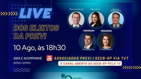 Os eleitos da Previ fazem nesta quinta-feira 10 de agosto, às 18h30, nova live nos canais do YouTube e do Facebook do Associados Previ para discutir, entre outros temas, os resultados atualizados do Plano 1 e do Previ Futuro, o andamento do Grupo de Trabalho que está discutindo o novo arcabouço legal dos fundos de pensão fechados, o estatuto e a governança da Previ. Clique aqui para participar da transmissão.