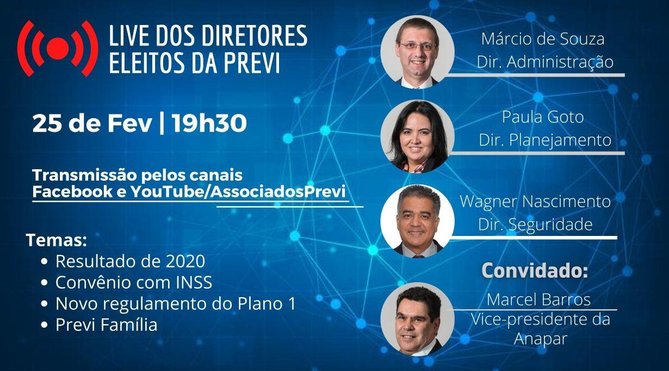 Será a primeira live de 2021 dos diretores eleitos Márcio de Souza (Administração), Wagner Nascimento (Seguridade) e Paula Goto (Planejamento). Também haverá a participação, como convidado, do vice-presidente da Anapar e ex-diretor eleito de Seguridade da Previ Marcel Barros.