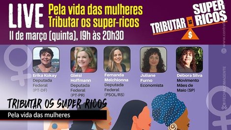 A Campanha Tributar os Super-ricos vai realizar, nesta quinta-feira (11), a partir das 19h, para tratar do assunto. Será um bate-papo com um time de peso, formado pelas deputadas federais Erika Kokay (PT-DF), Gleisi Hoffmann (PT-PR) e Fernanda Melchionna (PSOL-RS), além da economista Juliane Furno e a fundadora do Movimento Mães de Maio, da Baixada Santista (SP), Débora Silva.