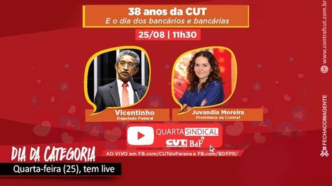 Dia 28 de agosto é o Dia do Bancário e da Bancária e também quando a Central Única dos Trabalhadores (CUT) completa 38 anos. Sobre os dois temas, será feita uma live nesta quarta-feira (25), às 11h30. Participam a presidenta da Confederação Nacional dos Trabalhadores do Ramo Financeiro (Contraf-CUT), Juvandia Moreira, e o deputado federal Vicente Paulo da Silva, o Vicentinho (PT-SP), ex-presidente da CUT.