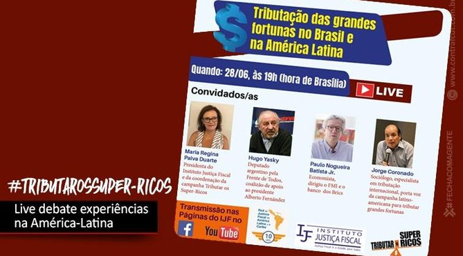 A campanha Tributar os Super-Ricos debate nesta segunda-feira (28) sobre a tributação das grandes fortunas na América Latina. O debate, com transmissão ao vivo pelo Facebook e Youtube do Instituto Justiça Fiscal (IJF), a partir das 19h, será retransmitido pelo Facebook da Confederação Nacional dos Trabalhadores do Ramo Financeiro (Contraf-CUT).