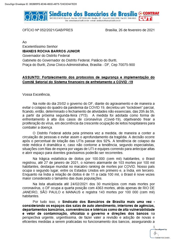 Na luta constante pela defesa da vida e das condições dignas de trabalho dos bancários de Brasília, o Sindicato endereçou ofício ao GDF e a todos os bancos da base de Brasília.