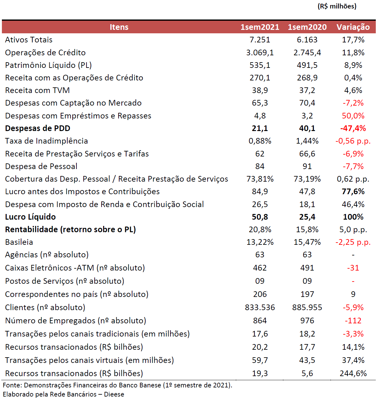 Veja abaixo a tabela resumo do balanço do Banese elaborada pelo Departamento Intersindical de Estatística e Estudos Socioeconômicos (Dieese).