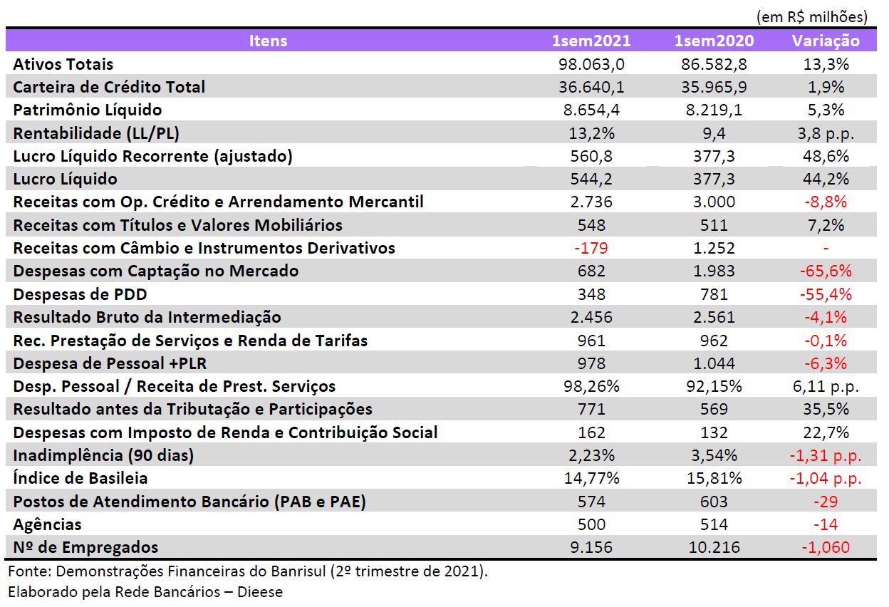 Os ativos totais cresceram 13,3% em doze meses, totalizando R$ 98,1 bilhões. O patrimônio líquido também se expandiu, em 5,3% no período, alcançando R$ 8.7 bilhões. A carteira de crédito total cresceu 1,9% em relação a junho de 2020, com queda de 0,6% no trimestre, totalizando a R$ 36,6 bilhões (a carteira de crédito representa 37,4% do total de ativos do Banrisul). A carteira pessoa física totalizou R$ 21,862 bilhões, com alta de 2,5% em doze meses. As operações voltadas para pessoa jurídica tiveram leve alta de 3,5% no período, somando R$ 6,198 bilhões.