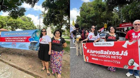 “A luta é conjunta, o Sindicato dos Bancários, o Sindicato dos Urbanitários, a CUT Pará, todos os movimentos estão na mesma vibe lutando contra a taxa de juros alta e querendo barrar a privatização da Cosanpa; as duas coisas elas são absolutamente danosas para população e para sociedade como um todo; então não à privatização da Cosanpa e não à taxa de juros altas”, afirma a vice-presidenta do Sindicato, Vera Paoloni, que também é presidenta da CUT-PA.