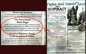 São Paulo – Conhecido como “rei da soja”, o ministro da Agricultura, Pecuária e Abastecimento do governo de Michel Temer (PMDB), Blairo Maggi (PP) foi ironizado na COP 13, a Conferência das Partes da Convenção da Diversidade Biológica das Nações Unidas (ONU), realizada em Cancún, no México. Nesta sexta-feira (9), a Coalizão Contra a Biopirataria (CAB, na sigla em inglês) o "condecorou" com o diploma de vencedor do prêmio Capitão Gancho, na categoria duas caras. Como ele e nem ninguém do governo estavam mais no evento, o prêmio foi entregue a representantes de organizações da sociedade civil brasileira, que deverão fazer chegar ao ganhador de fato.