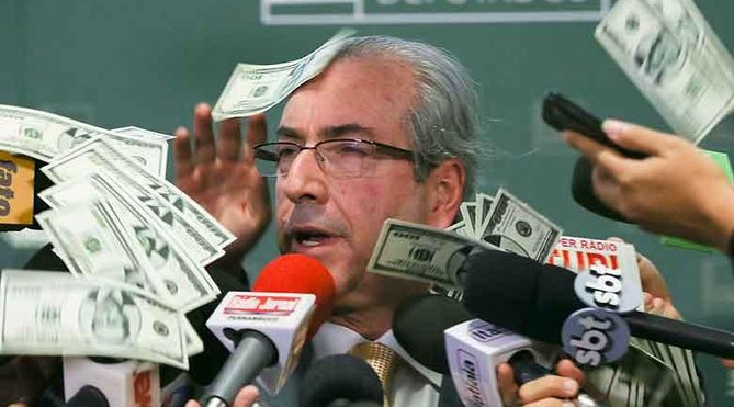 Brasília – Em mais um ato insólito envolvendo manifestantes e parlamentares no Congresso, o presidente da Câmara, Eduardo Cunha (PMDB-RJ), foi surpreendido por notas falsas de dólares atiradas contra ele no salão verde da Casa. Cunha estava se preparando para dar uma entrevista quando um manifestante, identificado depois pela polícia legislativa como Thiago Ferreira, militante do movimento Levante Popular da Juventude (LPJ), derramou os dólares sobre a cabeça do parlamentar gritando “receba sua encomenda da Suíça”. Ele e Carla Bueno, também do Levante, foram detidos.
