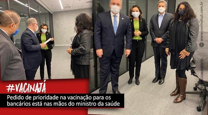 O ministro da Saúde, Marcelo Queiroga, recebeu, nesta sexta-feira (11), o ofício da Confederação Nacional dos Trabalhadores do Ramo Financeiro (Contraf-CUT) com a solicitação de inclusão da categoria bancária no Plano Nacional de Imunização (PNI) contra a Covid-19 e as informações e dados complementares que mostram tal necessidade pelas mãos das coordenadoras do Comando Nacional dos Bancários, Juvandia Moreira e Ivone Silva, presidentas da Contraf-CUT e do Sindicato dos Bancários de São Paulo Osasco e Região, respectivamente.