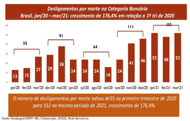 Dados do Cadastro Geral de Empregados e Desempregados (Caged) compilados pelo Departamento Intersindical de Estatísticas e Estudos Socioeconômicos (Dieese), mostram que a categoria bancária registrou um crescente número de encerramento de contratos de trabalho por morte, seguindo uma tendência similar aos casos de óbitos desde o início da pandemia do novo coronavírus.