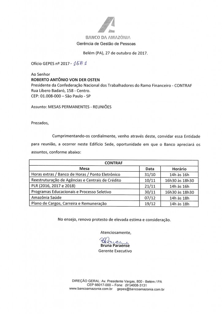 De acordo com o cronograma proposto pelo Banco da Amazônia, ainda teremos em novembro mesa de negociação permanente sobre Reestruturação, PLR (2016, 2017 e 2018) e Programas Educacionais e Processos Seletivos. Já para dezembro a previsão é de mesa de negociação sobre o plano Amazônia Saúde e PCCR.