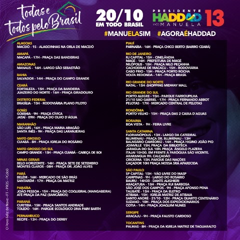 Do outro lado, temos a candidatura de Fernando Haddad que, neste segundo turno, representa uma Frente Ampla pela democracia, com os apoios dos partidos (PDT, PSB e PSOL) e também de um conjunto de lideranças, artistas, movimento social e cívico que tem como objetivo resguardar a democracia e nossos direitos políticos e sociais impondo uma derrota nas urnas a Jair Bolsonaro e o seu projeto de atraso. Só o voto em Haddad, pode impor essa derrota. Por isso agora todos/as somos #HaddadSim.