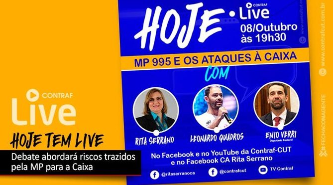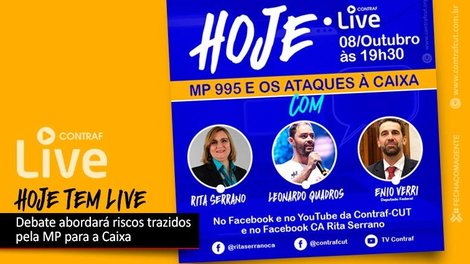 A Contraf-CUT transmite nesta quinta-feira (8), ao vivo, a partir das 19h30, um debate sobre a Medida Provisória 995/2020, que coloca em risco a Caixa Econômica Federal, a soberania nacional e o emprego dos trabalhadores da Caixa.