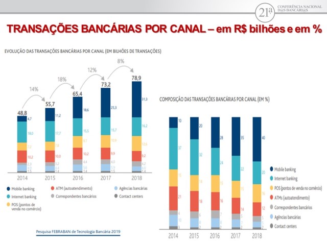De acordo com pesquisa realizada pela Federação Brasileira dos Bancos (Febraban), as tecnologias que mais receberam investimentos em 2019 foram o BIG Data / Analitics (80%) e inteligência artificial (73%). “As tecnologias de análise de dados e de atendimento aos clientes sem a intermediação humana são as prioridades de investimentos pelos bancos na área de tecnologia”, disse a economista.