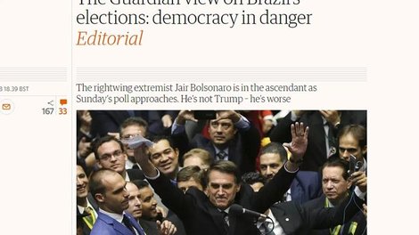 The Guardian afirma que chamar Bolsonaro de "Donald Trump da América Latina, como alguns fizeram, é ser gentil demais". "Bolsonaro é um misógino e homofóbico cujas opiniões sobre comunidades indígenas e o ambiente são muito sombrias. Ele elogia torturadores e a ditadura militar que governou o Brasil entre 1964 e 1985. Recentemente defendeu tiros contra seus oponentes."