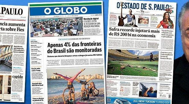 Já o jornal da família Marinho optou por falar sobre o monitoramento das fronteiras do País, onde apenas 4% são monitoradas. Enquanto isso, o jornal Estado. de S. Paulo se dedica à safra de grãos do Brasil, que injetará R$ 200 bilhões na economia, num esforço para trazer otimismo à atividade econômica combalida pela política de Michel Temer.