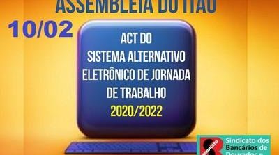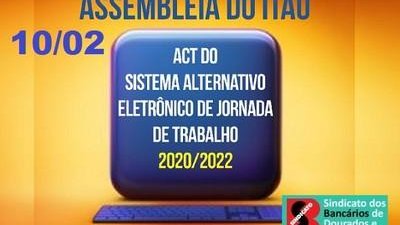 O Sindicato dos Bancários de Dourados e Região-MS convoca os funcionários do Itaú Unibanco para a assembleia na quarta-feira (10), das 8h às 19h, para apreciar e deliberar sobre a proposta de aprovação do acordo coletivo que regulamenta o sistema alternativo eletrônico de jornada de trabalho 2020/2022.