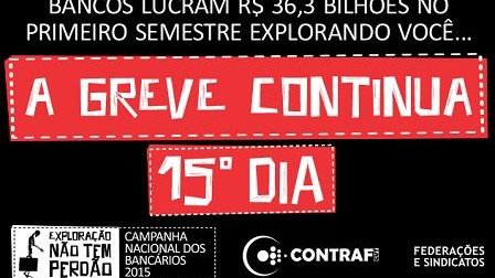 O 15º dia de greve continua com fortes mobilizações. A terça-feira (20) amanheceu com agências e centro administrativos paralisados em todo o Brasil. Foi a força da greve que arrancou nova negociação com os bancos. A Fenaban entrou em contato com a Contraf-CUT no começo da noite de ontem (19) e chamou o Comando Nacional dos Bancários para uma nova rodada da Campanha 2015, nesta terça, às 16h, em São Paulo.