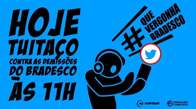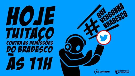 Os bancários de todo o Brasil vão participar nesta terça-feira (17), às 11h, do tuitaço contra as demissões no Banco Bradesco. Os trabalhadores devem utilizar e divulgar as hashtags #QueVergonhaBradesco e #QuemLucraNãoDemite nos seus perfis nas redes sociais, preferencialmente no Twitter. A ação faz parte da campanha organizada pela Confederação Nacional dos Trabalhadores do Ramo Financeiro (Contraf-CUT) e pela Comissão de Organização dos Empregados (COE) do Bradesco, que visa denunciar a quebra do compromisso assumido pela Federação Nacional dos Bancos (Fenaban), feito em mesa de negociação com o Comando Nacional Bancário, de não realizar demissões durante a pandemia.