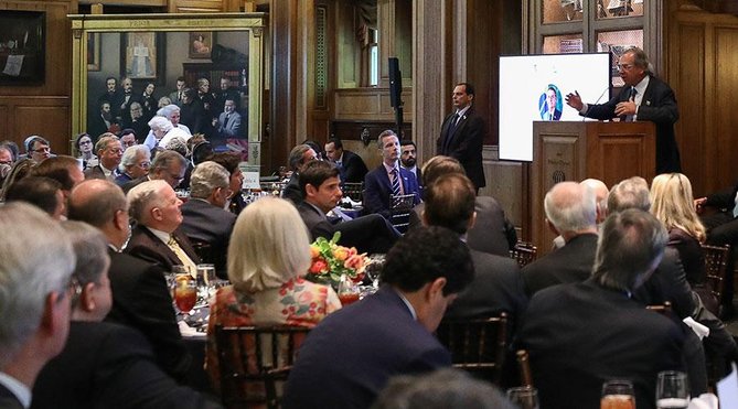 Em discurso em Dallas nesta quinta-feira (16), durante homenagem da Câmara de Comércio Brasil-Estados Unidos a Jair Bolsonaro, o ministro da Economia, Paulo Guedes, falou em fazer uma fusão entre Banco do Brasil e Bank of America aos moldes do que “já fizemos entre a Embraer e Boeing”.