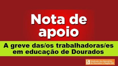 O Sindicato dos Bancários de Dourados e Região-MS se solidariza com a luta dos/as professores/as e do administrativo educacional da rede municipal, por entender que a luta por uma educação pública e de qualidade é reflexo de uma política de valorização de todas/os trabalhadores/as, estudantes e comunidade escolar. Que esta greve fortaleça a resistência contra a crescente retirada de direitos.